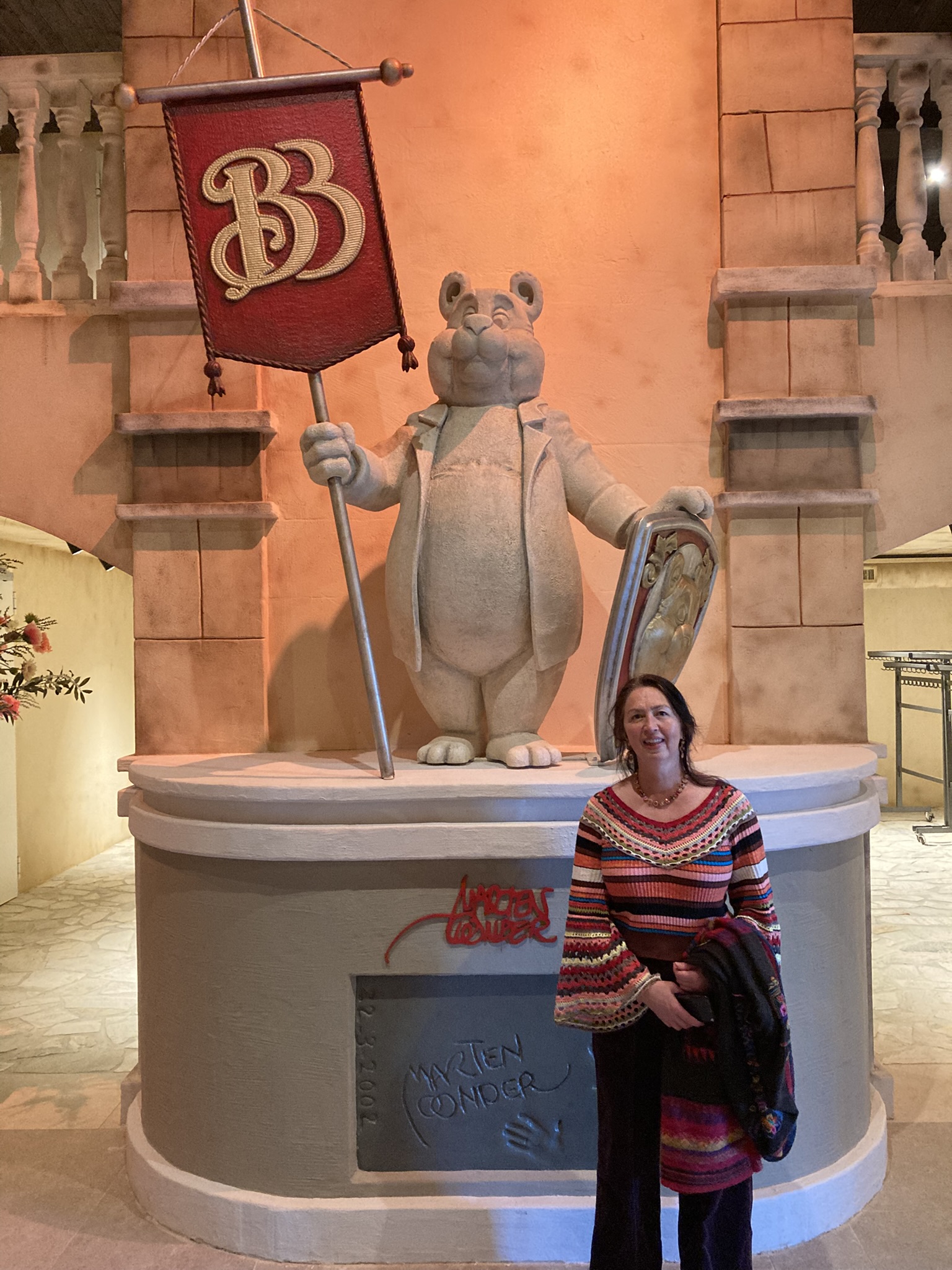 Bij de inloop in de ontvangsthal valt meteen het standbeeld van heer Bommel op: fier met schild en vaandel, met in de sokkel verwerkt de handafdrukken van Marten Toonder die vroeger deel uitmaakten van de ‘walk of fame’ in Rotterdam.